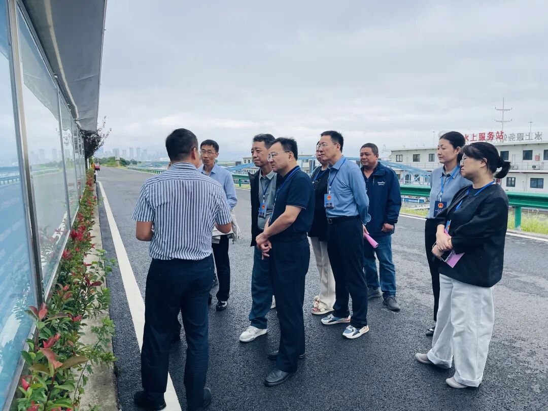 代表小组首先来到引江济淮工程重要节点派河口枢纽。实地察看了派河口服务区、船闸等关键设施,详细了解了工程建设和运行管理情况。派河口枢纽作为江淮沟通段的起点工程,总投资10.56亿元,其船闸可通行2000吨级船舶,配套服务区功能完善,对提升区域水运能力、优化水资源配置具有重要意义。代表们就工程质量管控、安全生产等工作与项目方进行了深入交流。